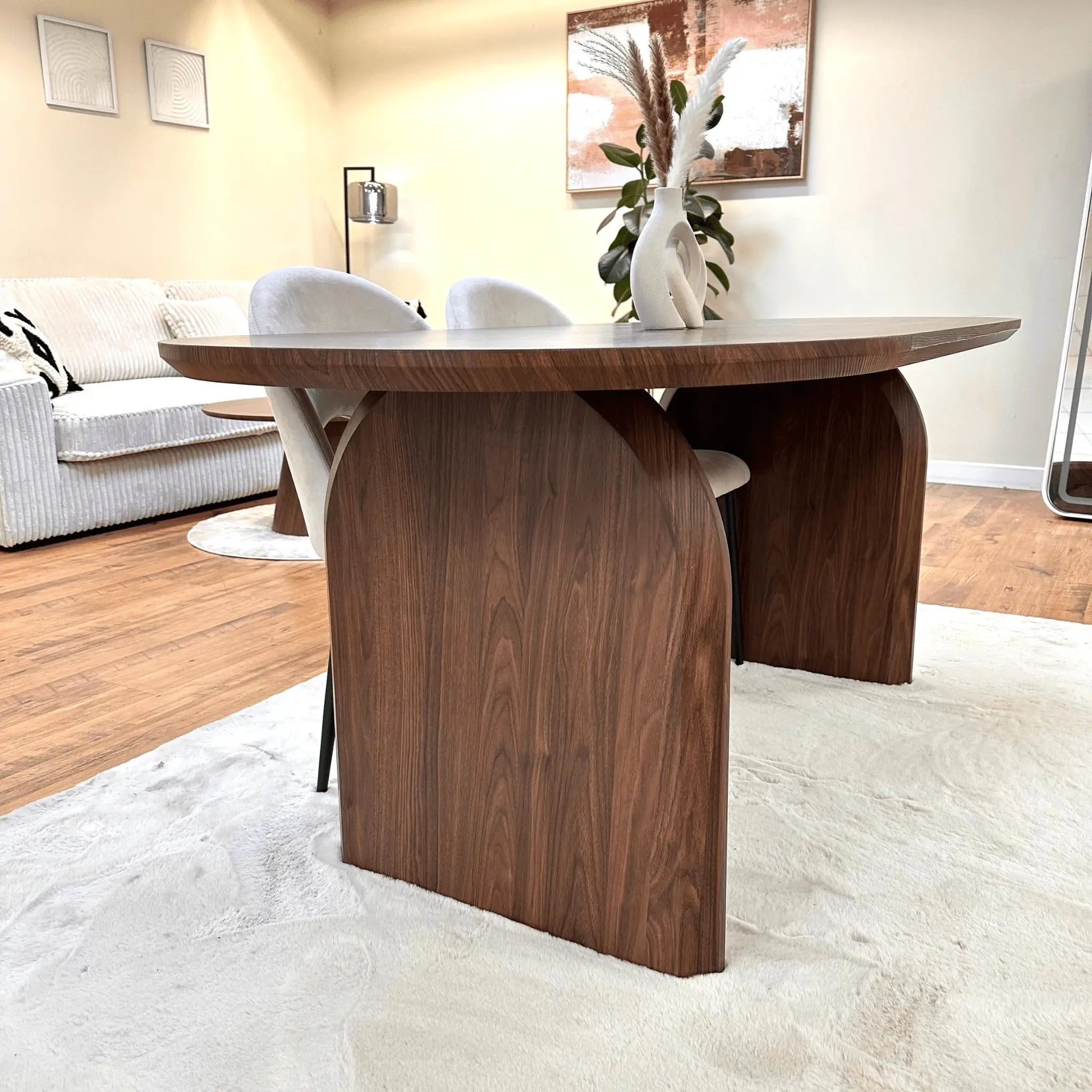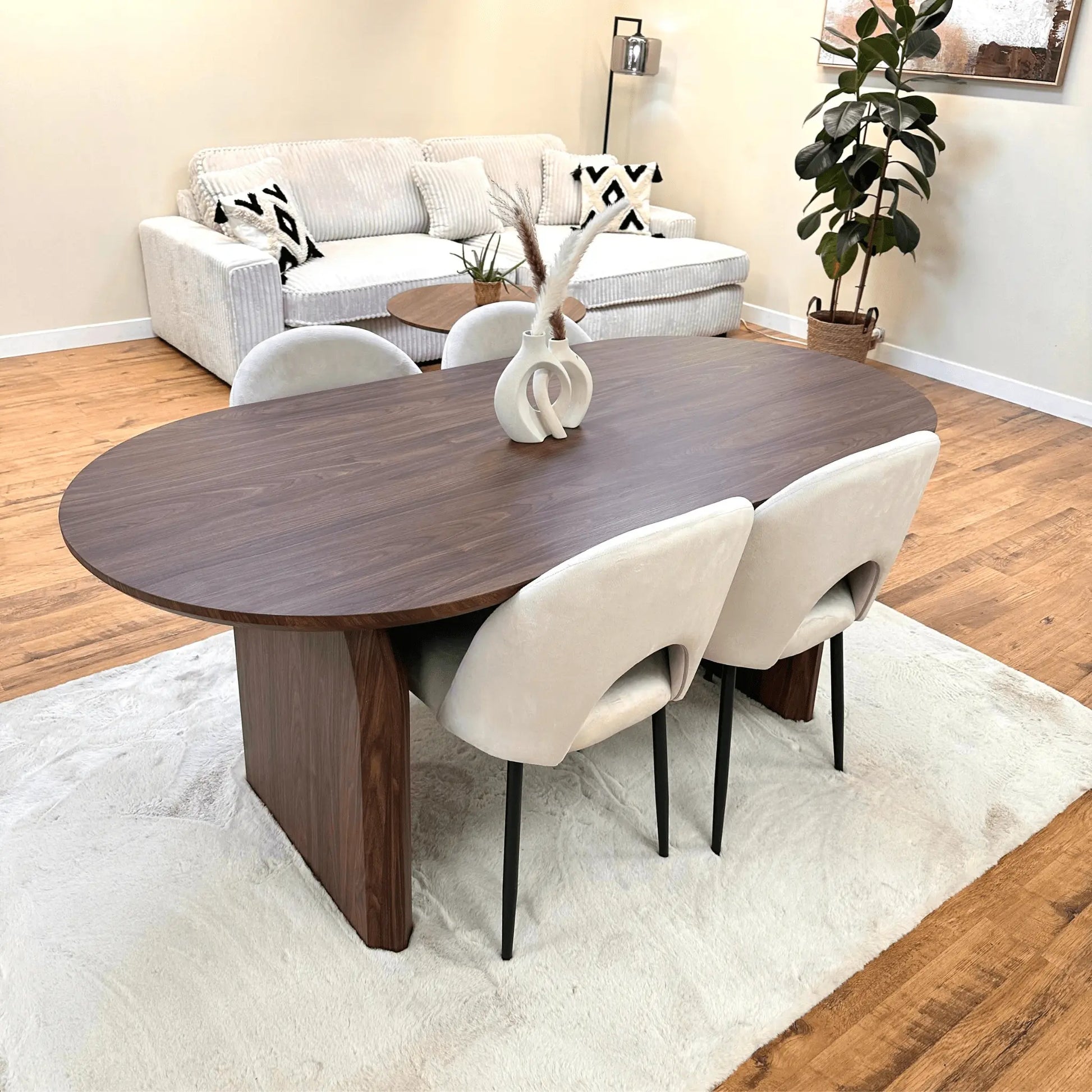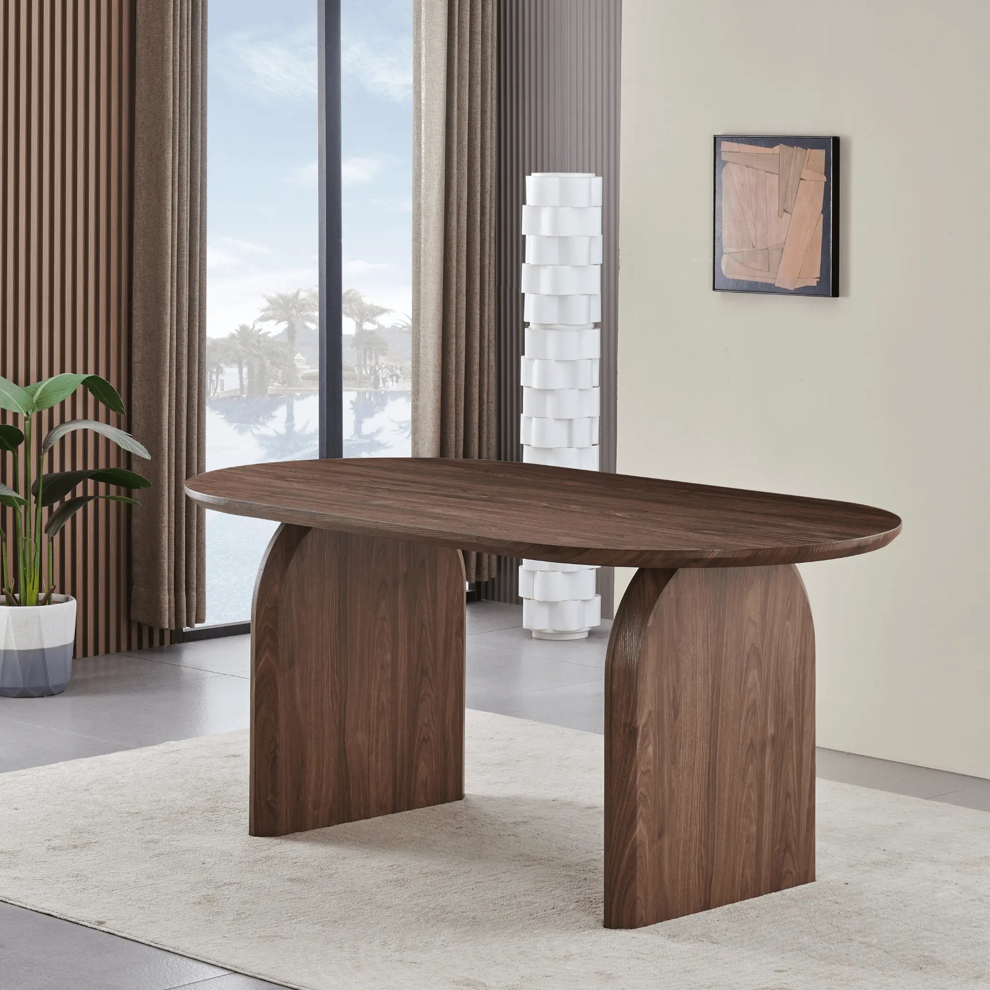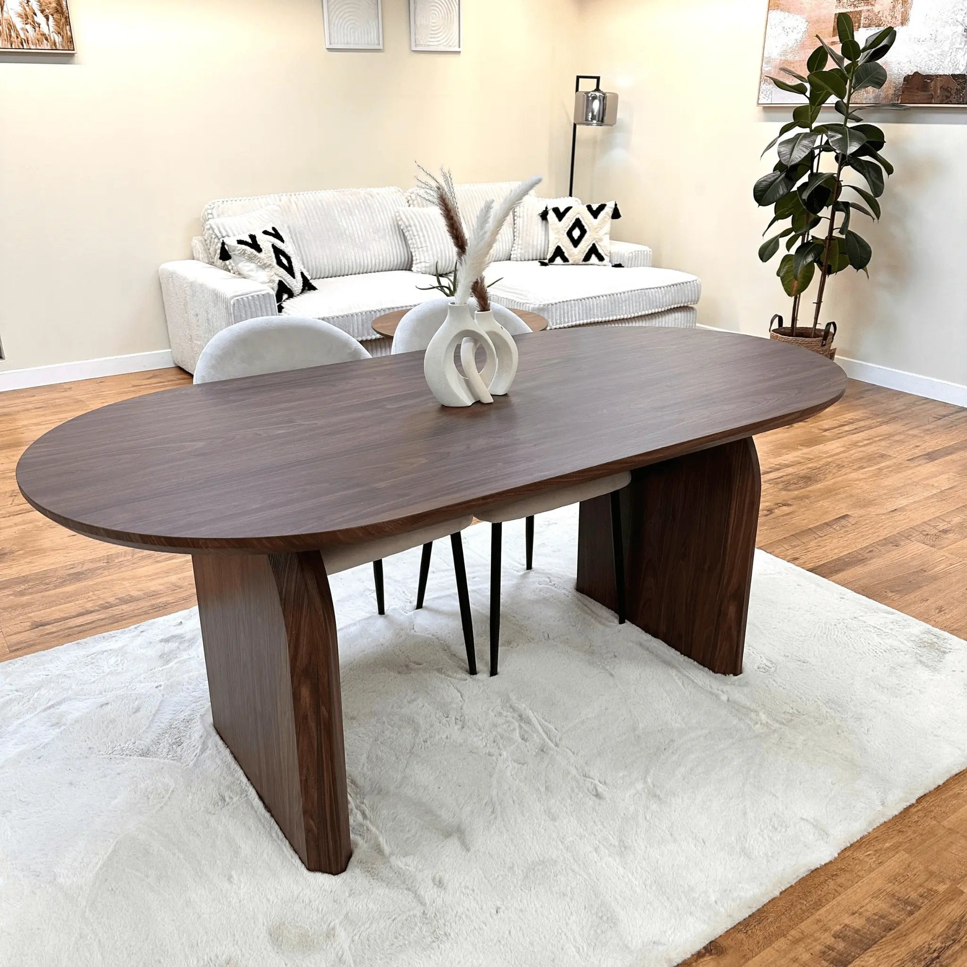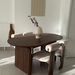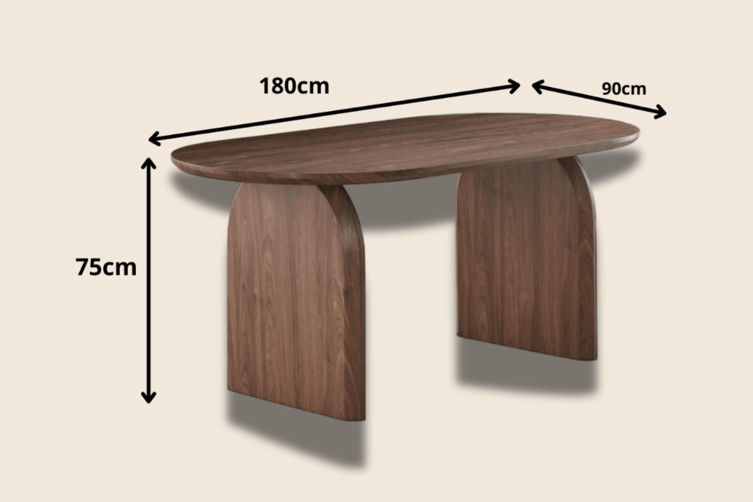 Avec une longueur de 180cm, une hauteur de 75cm et une forme ovale, cette table en bois MDF couleur noyer offre un look moderne et épuré.